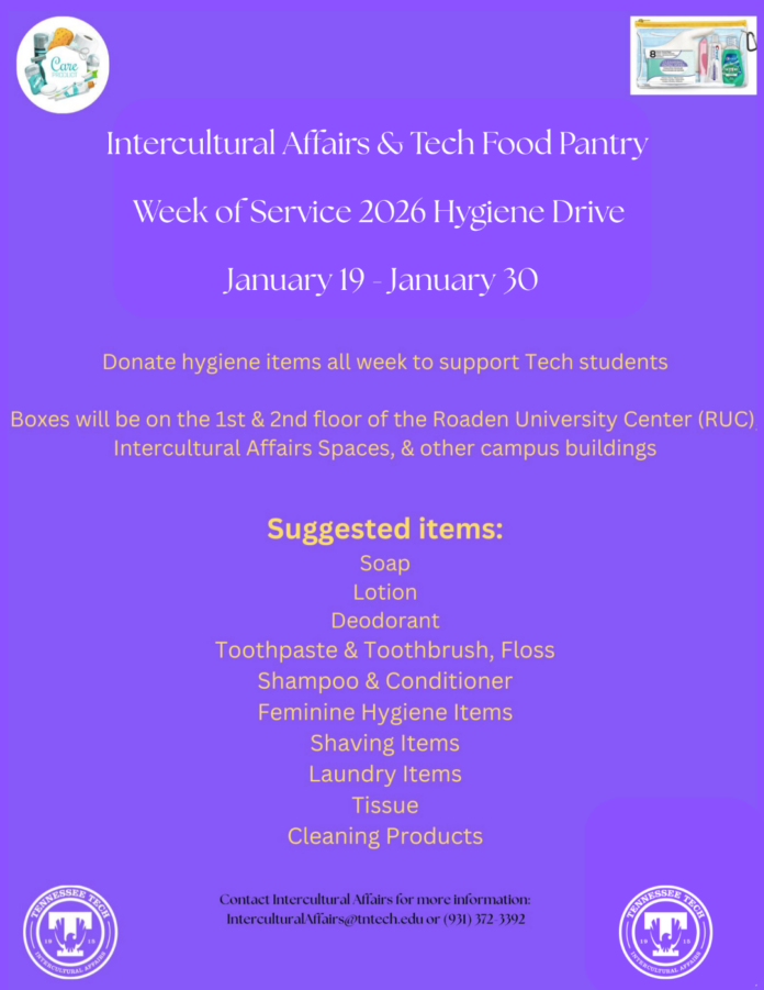 We encourage you to donate to support the TTU Food Pantry! Donate hygiene items throughout the week! The hygiene drive starts on January 19th and runs through January 30th. Donation boxes will be located on the 1st and 2nd floors of the Roaden University Center (RUC), in Intercultural Affairs spaces, and at other campus buildings like TJ Farr and the STEM Center. Suggested items are listed on the attached purple flyer.