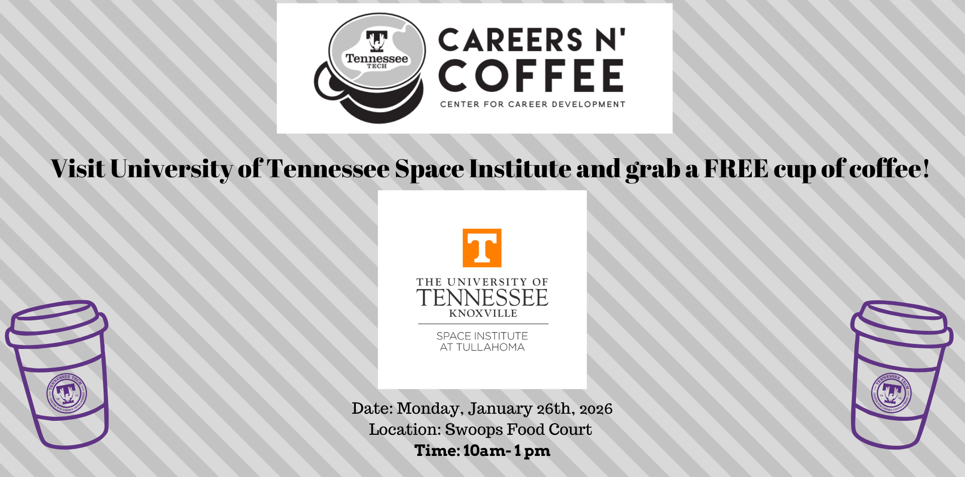Take a break and enjoy a FREE cup of coffee while speaking with recruiters from UT Space Institute on Mon, Jan. 26, at 10 a.m. in the RUC’s Swoops Food Court.