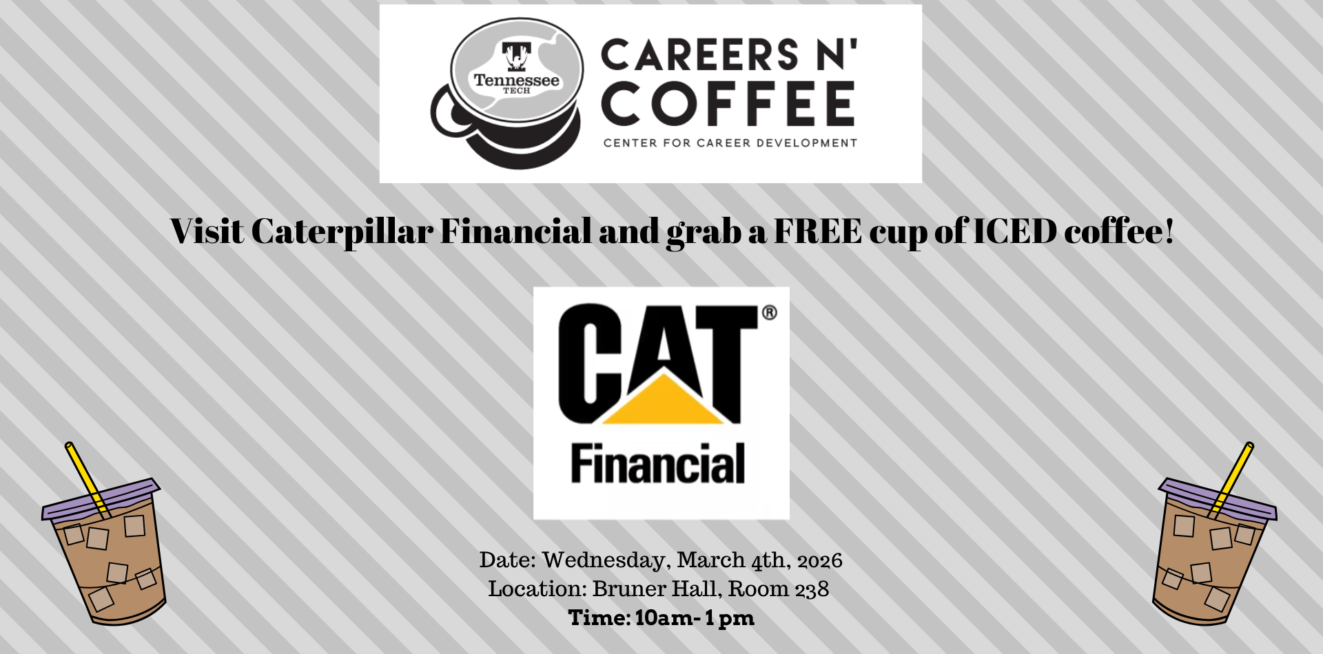 Take a break and enjoy a FREE cup of coffee while speaking with recruiters from Caterpillar Financial on Wed, March 4, at 10 a.m. in Bruner Hall, Room 238 and FOUNDATION HALL, outside Room 129