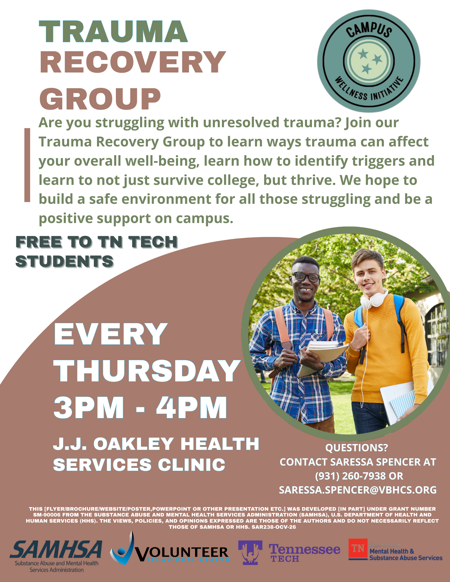 Please feel free to join our new trauma support group available on campus inside the J.J. Oakley Health Services Clinic! We will meet in the conference room every Thursday at 3PM. If there is another date/ time that would be better for you- reach out to me! Campus Wellness Initiative has additional groups that you can choose from during the week!