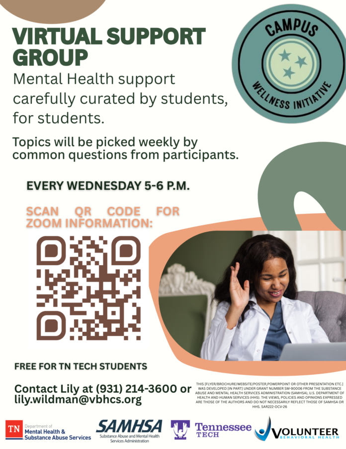 Please join Campus Wellness in our new virtual support group that is available every Wednesday (when offices are open) from 5pm to 6pm. This is a general topics group centered around support for mental health on campus. Saressa Spencer, MBSC will be hosting the group as a mental health counselor and will help direct conversations when needed. Come open minded and feel free to bring a topic that you would like to talk about!
