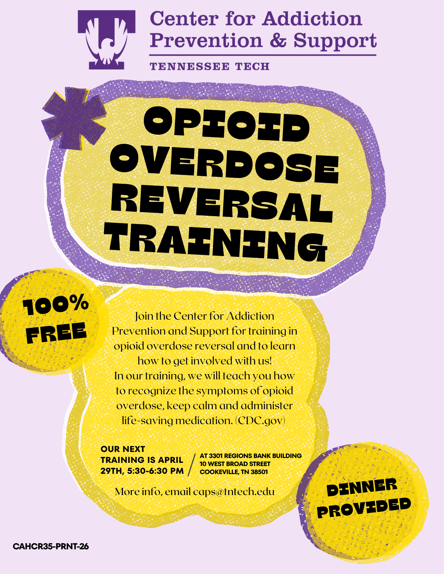 Join CAPS for a free Opioid Overdose Reversal Training on Wednesday, April 29, in the Regions Bank Building, Room 3301, 10 W. Broad St., Cookeville.