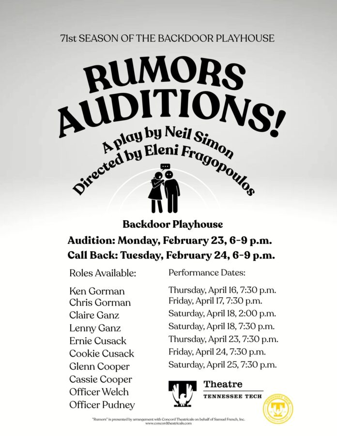 “Rumors” is presented by arrangement with Concord Theatricals on behalf of Samuel French, Inc. www.concordtheatricals.com