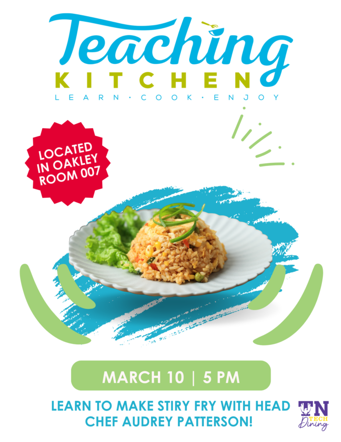Teaching Kitchen | Stir Fry 20 FacebookXPinterestWhatsApp Don’t forget! Tonight, you can discover the art of stir fry at our Teaching Kitchen with Chef Audrey on March 10 at 5pm in Oakley Hall, Room 007. Learn how to combine fresh ingredients and bold flavors to create a quick, delicious meal.