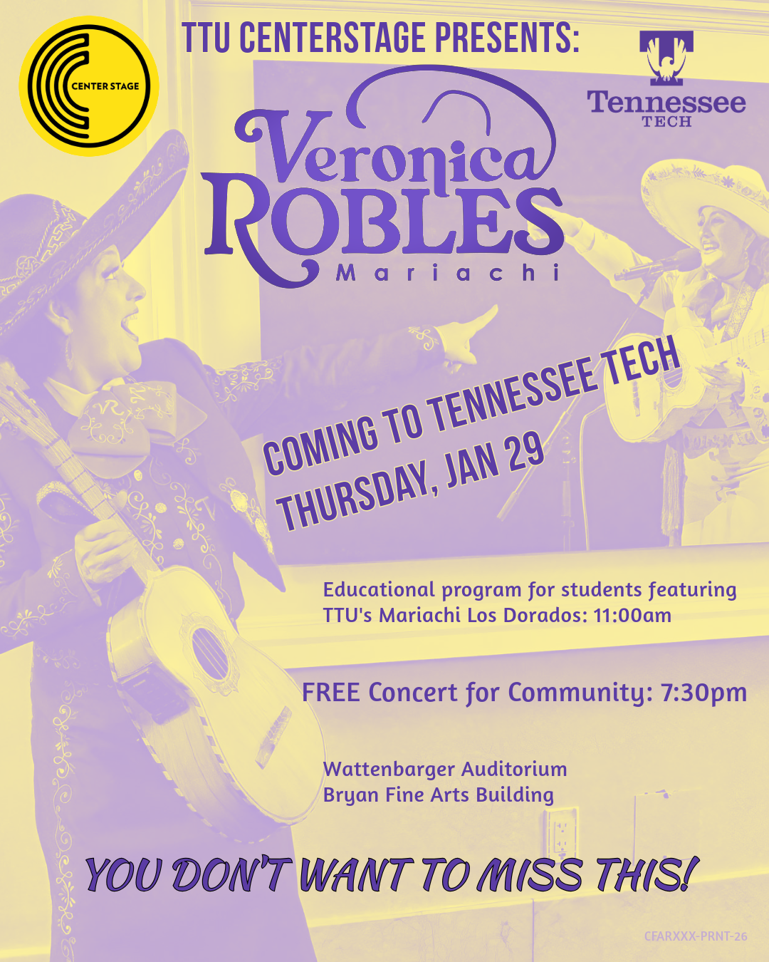 Center Stage is proud to bring mariachi superstar, Veronica Robles, and her band from Boston to Tennessee Tech. She and her ensemble members will be doing a residency on January 28 and 29, including a masterclass with our very own Mariachi los Dorados de TN Tech, a Dead Hour educational program, and a free concert open to the public on Jan. 29 at 7:30pm in Wattenbarger Auditorium.