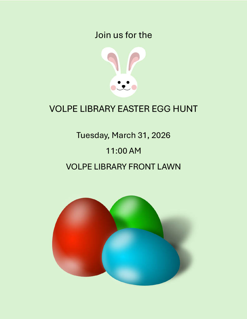 Volpe Library Student Easter Egg Hunt 14 FacebookXPinterestWhatsApp Join us for the Volpe Library Easter Egg Hunt! Tuesday, March 31, 2026, at 11 a.m. on the front lawn of the Volpe Library.