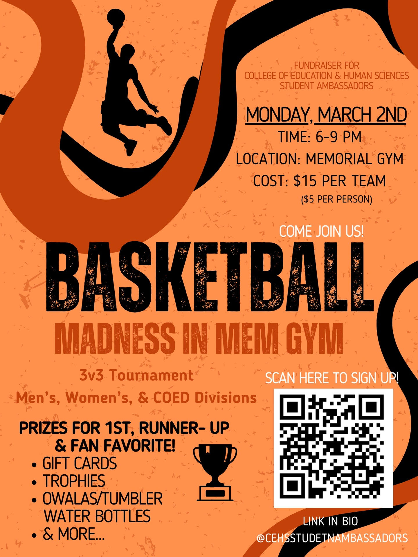Madness in Mem Gym 15 FacebookTwitterPinterestWhatsApp Join us Monday, March 2nd in Memorial Gym from 6-9 for a 3v3 tournament! We have men’s, women’s, and co-ed teams, along with 1st, 2nd, and fan favorite prizes! So bring your team and a crowd and let’s hoop!