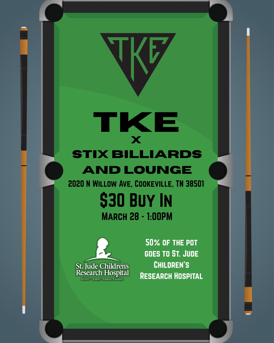TKE invites the community to Stix Billiards & Lounge, located at 2020 N. Willow Ave. in Cookeville, for a pool tournament on Saturday, March 28 at 1 p.m. 50% of all donations go to St. Jude Children’s Research Hospital. $30 buy-in. Come on by and have a good time!