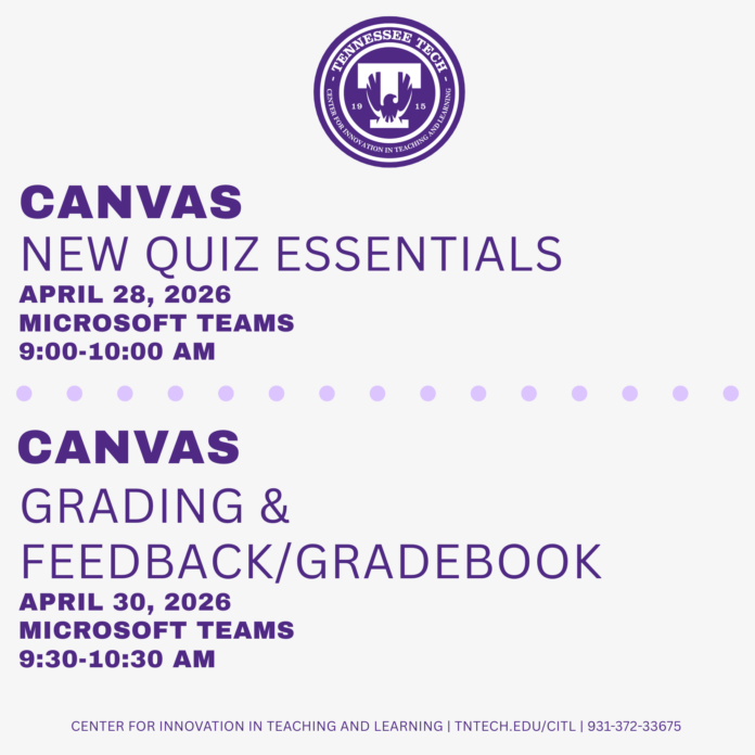 Join the Center for Innovation in Teaching and Learning this week for our two Canvas workshops. On Tuesday, April 28 from 9:00-10:00 AM we will cover New Quiz Essentials within Canvas. Then, on Thursday, April 30 from 9:30-10:30 AM, we will take a look at Grading & Feedback along with the Canvas Gradebook. Recordings of all sessions are available on the CITL website. Contact citl@tntech.edu and register to attend on the CITL website.