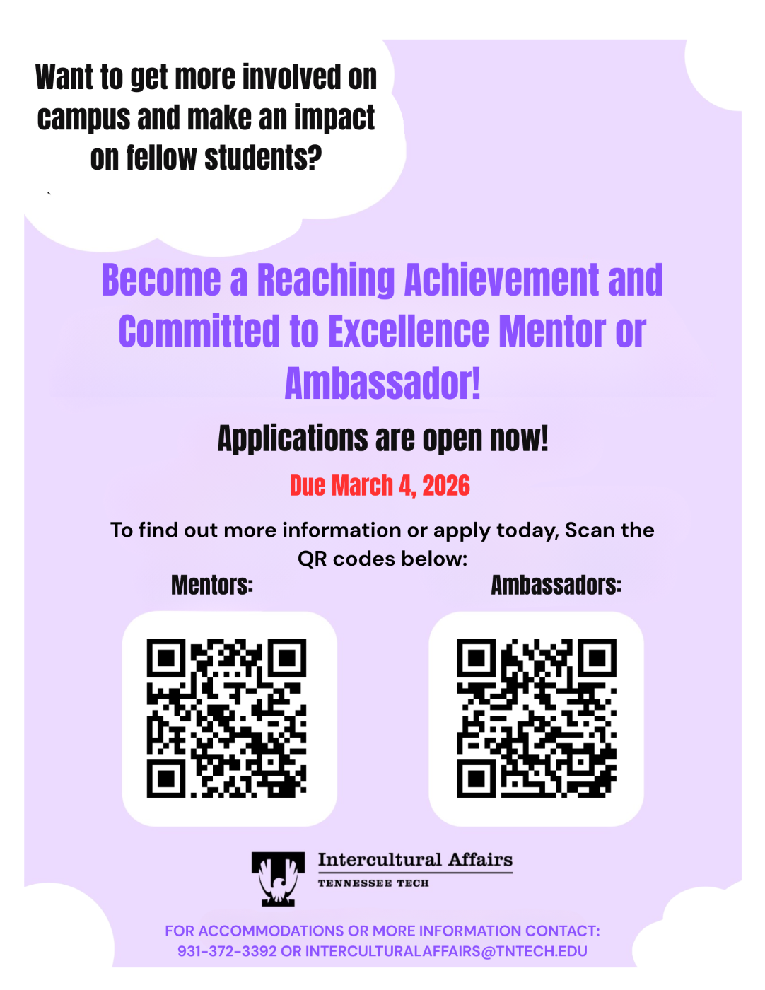 We are hiring mentors and ambassadors. Applications for the Intercultural Affairs 2026-2027 Ambassador Program & the Reaching Achievement and Committed to Excellence Peer Mentoring Program are now available on the Intercultural Affairs website. We hope that you will consider becoming an ambassador or serving as a mentor. Application deadlines are March 4, 2026.  All application information can be found using the following links below. Share this info with a friend who might be interested!