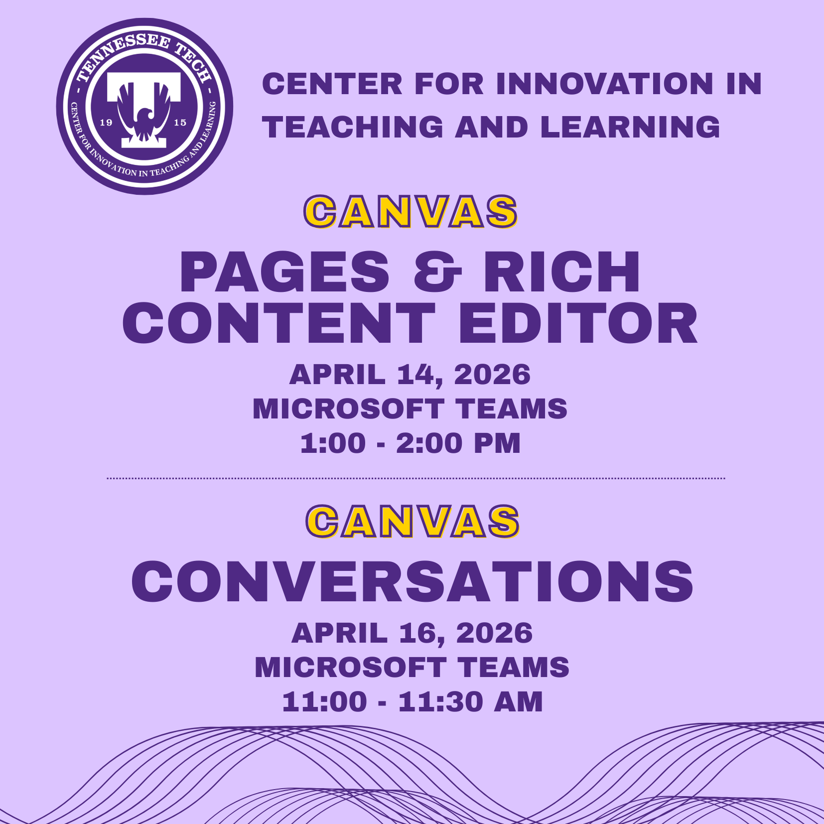Join the CITL for two Canvas workshops this week: Pages and Rich Text Editor on Tuesday, April 14th at 1:00-2:00 pm and Canvas Conversations on Thursday, April 16th at 11:00 AM via Teams. Register on the CITL website and contact citl@tntech.edu with questions.