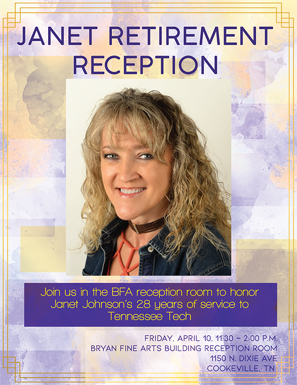 Please join the School of Art, Craft & Design in wishing Ms. Janet Johnson happy retirement! Janet served TN Tech for over 28 years, most recently as the SAC&D MVP administrative associate since 2013, and as a staff member with University Police prior. Janet is well known for her friendliness, promptness, and willingness to always lend a helping hand; she will be missed.