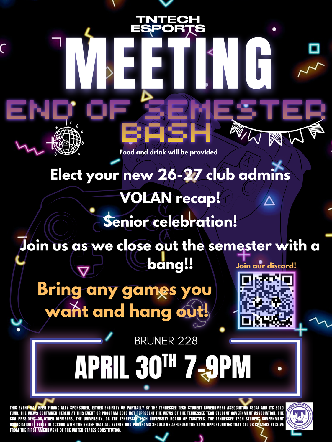 Join the Esports Club as we celebrate the end of the year! The club is meeting on Thursday, April 30 in Bruner 228 from 7pm-9pm. It is potluck style, bring something if you can, but catering from Chick-fil-a is also provided. Take a break and hang out! We will be electing new club officers, congratulating our graduating seniors, and highlighting our successes this year at VOLAN (our annually attended LAN). Bring any games you’d like to play and we’ll see you there :))