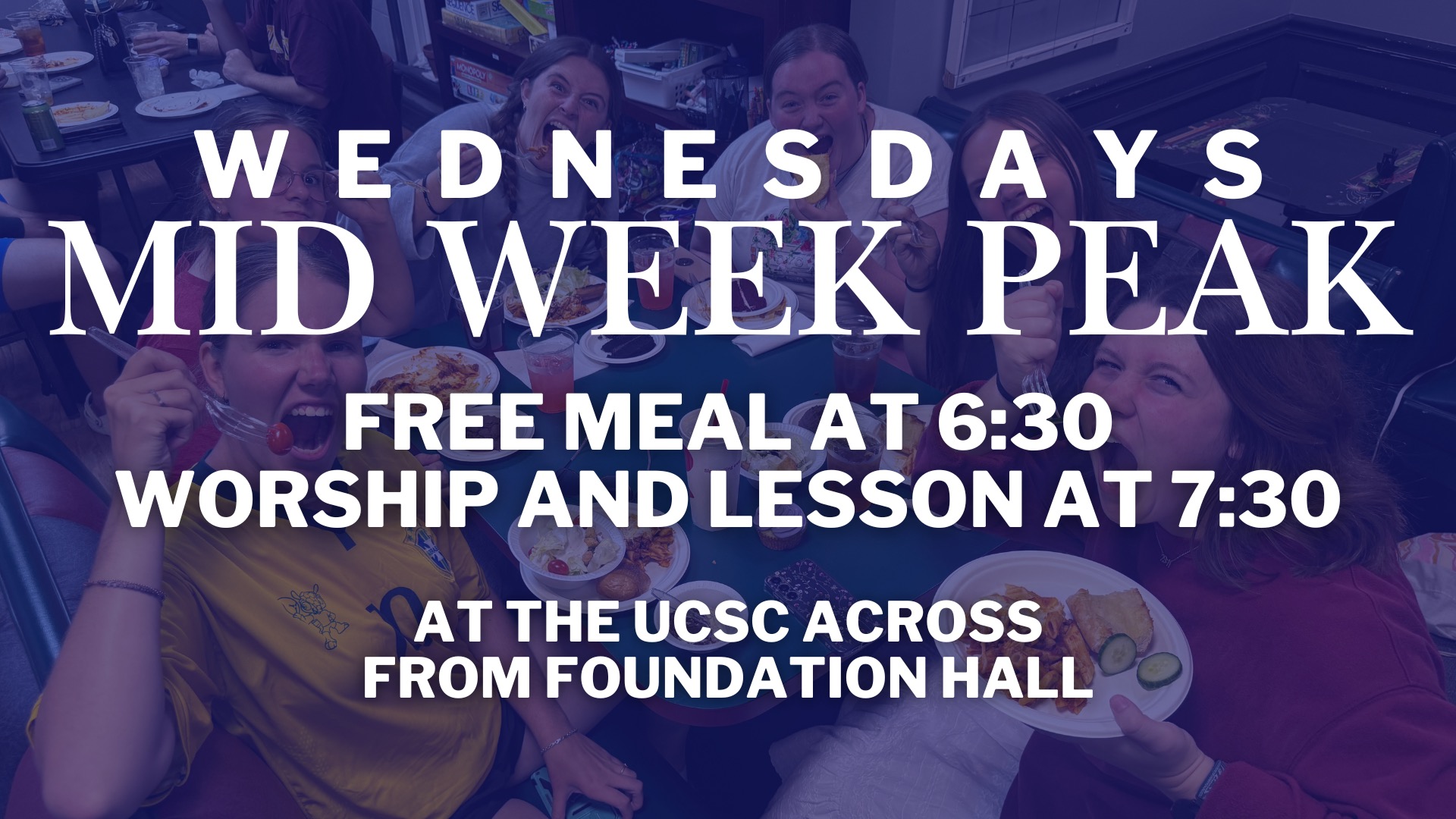 Join UCSC every Wednesday starting at 6:30 for a free meal. Following the meal, we share in a time in worship and being in the word together. Come share in a time of fellowship and community. Please reach out if you have any questions! We’d love to see you there!!
