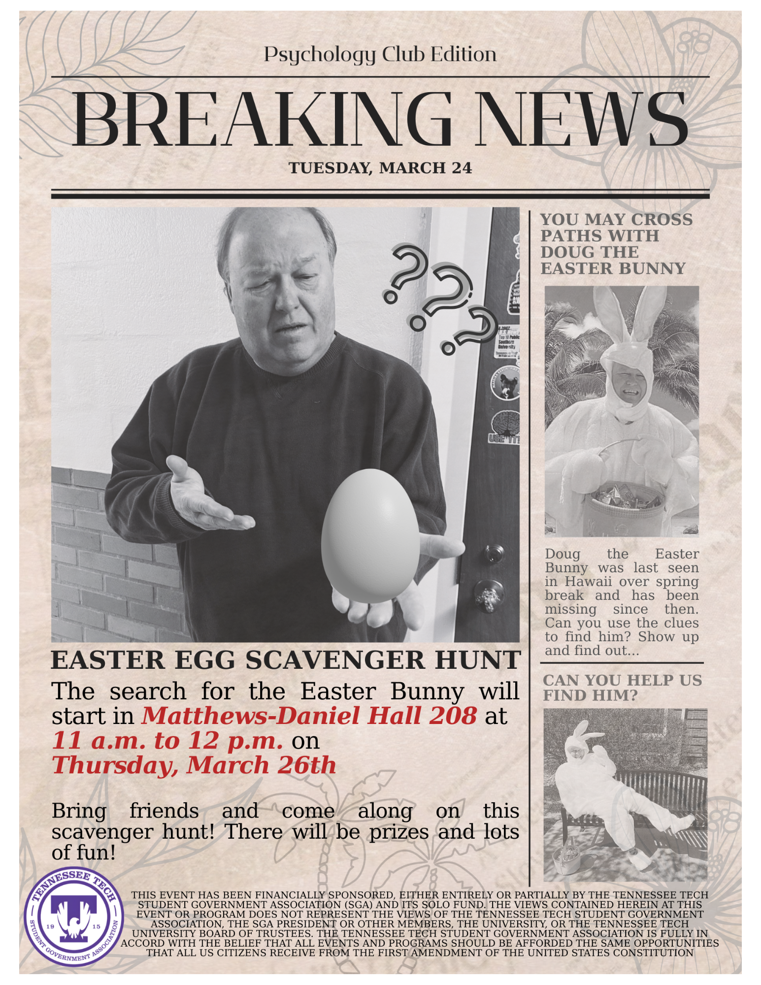 Psych Club’s Easter Egg Scavenger Hunt 14 FacebookXPinterestWhatsApp Bring friends and join the Psychology Club on a scavenger hunt to find Doug the Easter Bunny on Thursday, March 26, from 11 a.m. to 12 p.m.! The event will start in Matthews-Daniel Hall 208! There will be prizes and lots of fun!