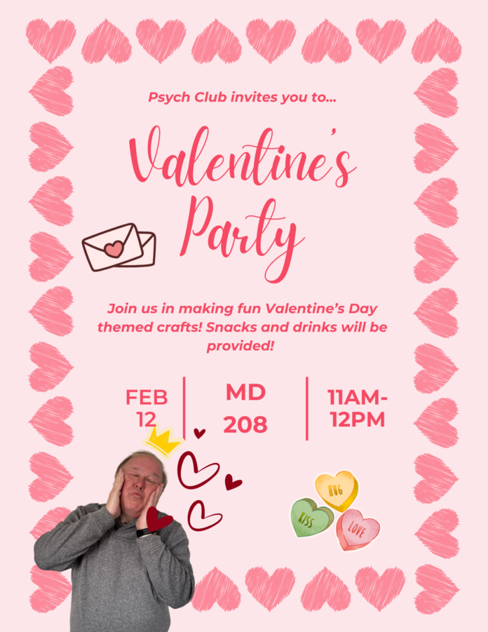 Psych Club’s Valentine’s Day Party! 10 FacebookTwitterPinterestWhatsApp Join the Psychology Club for our Valentine’s Day Party this Thursday, February 12, from 11 a.m. to 12 p.m. in Matthews-Daniel Hall 208. There will be crafts to do and cookies to decorate! We hope to see you there!