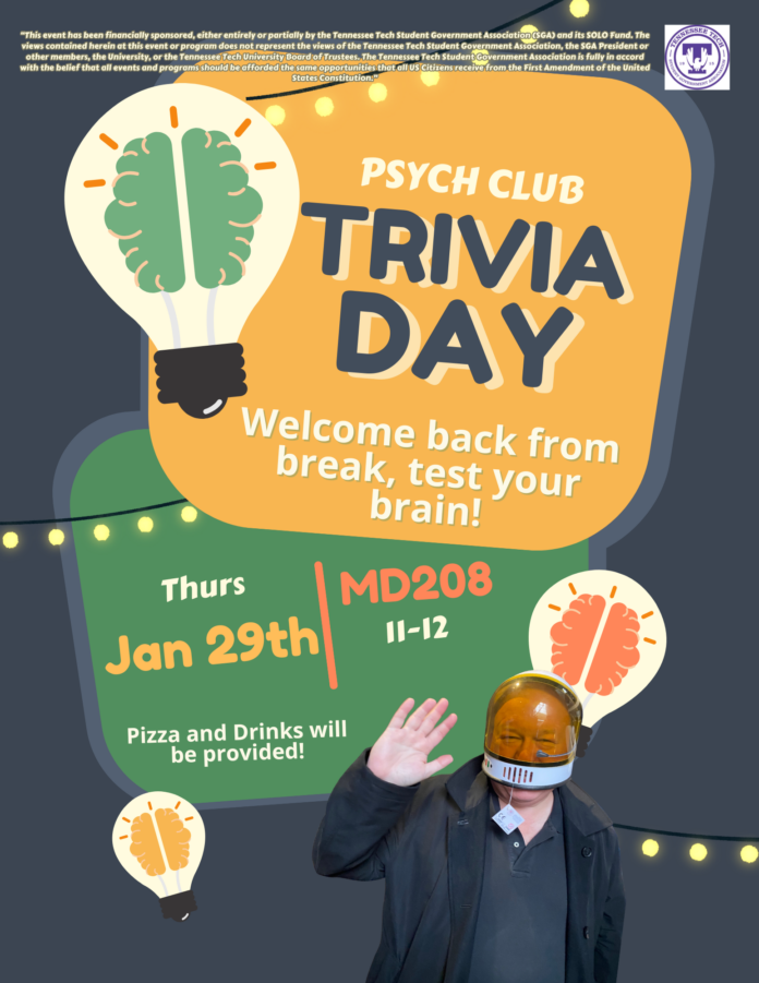 Psych Club’s Welcome Back Trivia! 73 FacebookTwitterPinterestWhatsApp Join the Psychology Club for our Welcome Back Trivia this Thursday, January 29, from 11 a.m. to 12 p.m. in Matthews-Daniel Hall 208. There will be pizza, drinks, hot cocoa, and prizes for the winners!