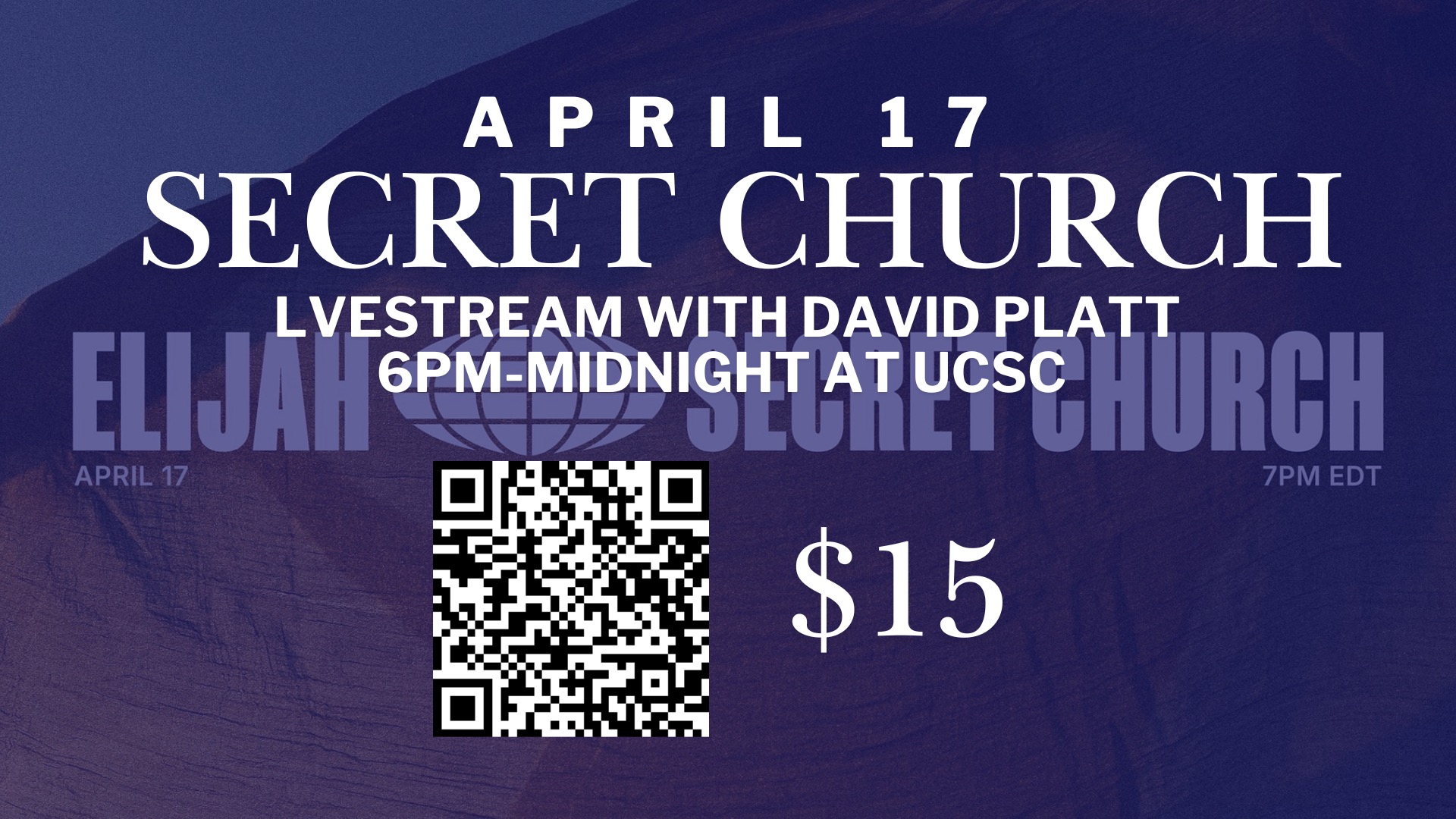 Join us as we live stream David Platt’s Secret Church. This will take place from 6 pm to midnight. Cost is $15 and will include a booklet to follow along and take notes. We will be going through the book of Elijah. There will be some snacks and desserts to enjoy! Please reach out to @ucsc_ttu with any questions!! You can pay at this link: https://subsplash.com/collegesidechurchofchris/lb/ev/+hvjkktt