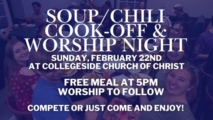 Join Collegeside Church of Christ for our annual soup and chili cook-off on February 22nd. We will start with a free meal at 5 pm and follow it with a time of worship. Whether you bring a soup or chili to compete or just come and eat, we’d love to see you! Please reach out to @ucsc_ttu with any questions!!
