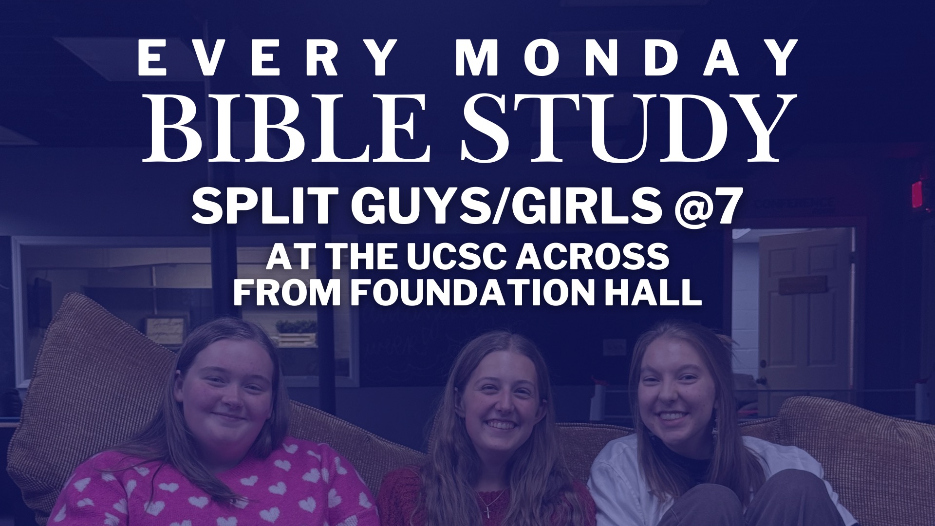 Join UCSC every Monday for split girls and guys bible study! We will meet at UCSC at 7pm. The girls will meet downstairs at UCSC and the guys will meet upstairs. Join us for time in the Word with others! Join us for fellowship and good discussions. We will even have cookies beforehand! We hope to see you there!!
